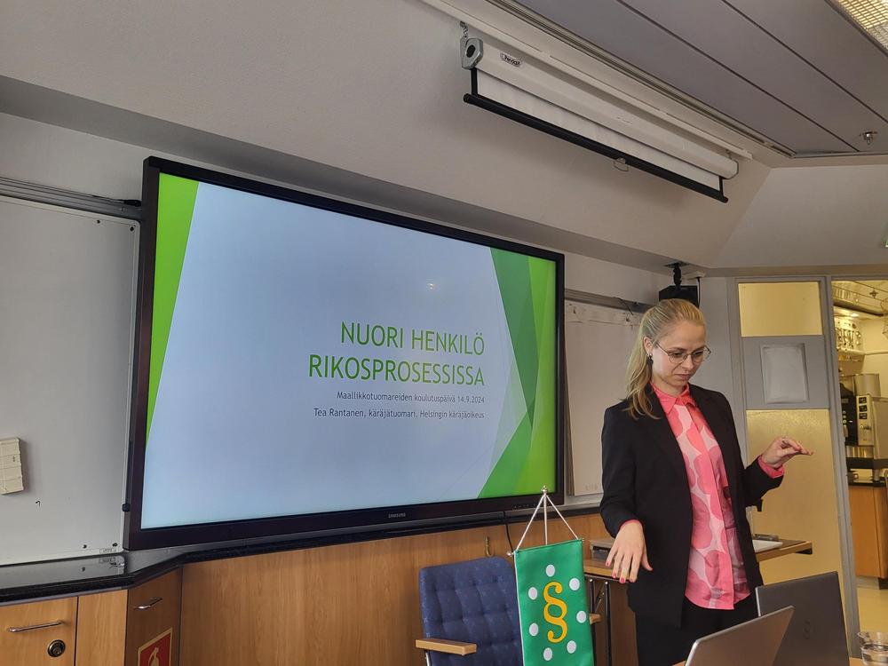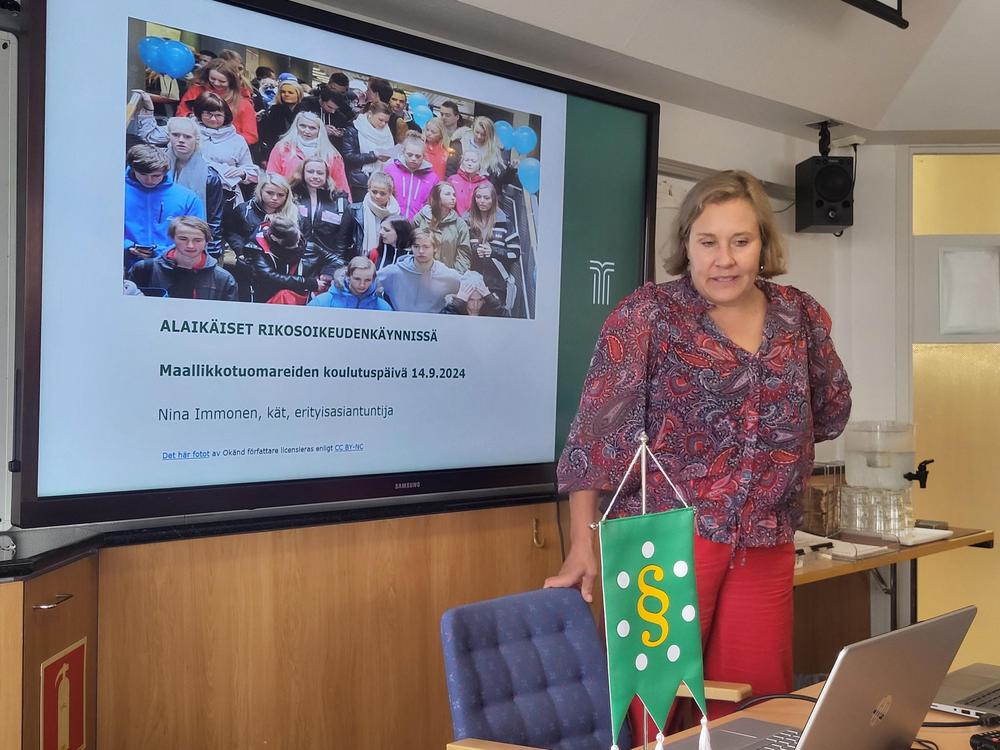 12.45 Käräjätuomari Nina Immonen alustaa koulutukseen osallistujia koulutusteemaa käsittelevää ”nuoret rikosprosessissa”.