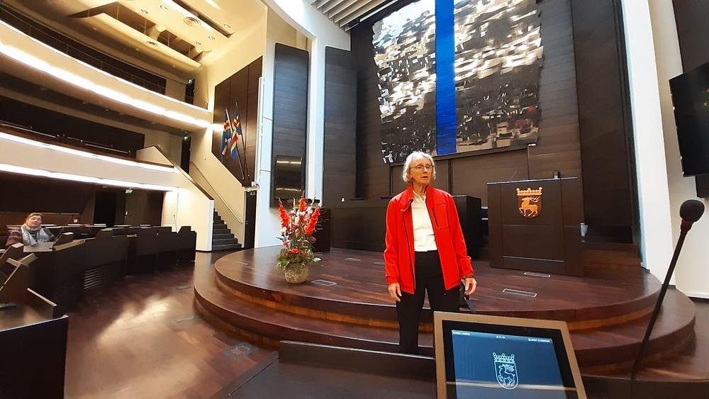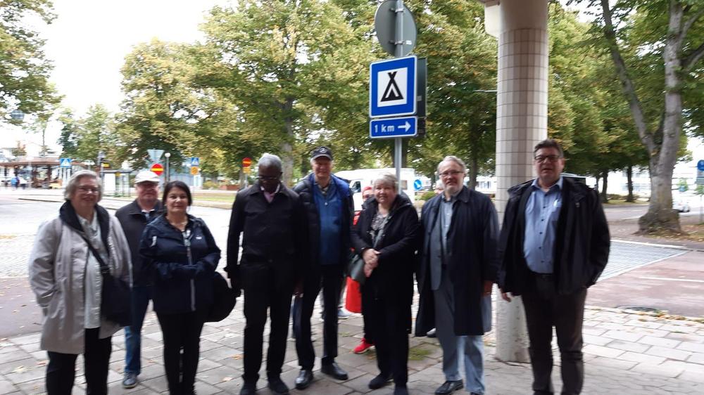 Klo 10.00 lähtö retkelle ”Rikosten ja rangaistusten Tukholma”, bussin ikkunassa kyltti ”Suomen Maallikkotuomarit”, paikallinen opas vastassa terminaalin ulkopuolella