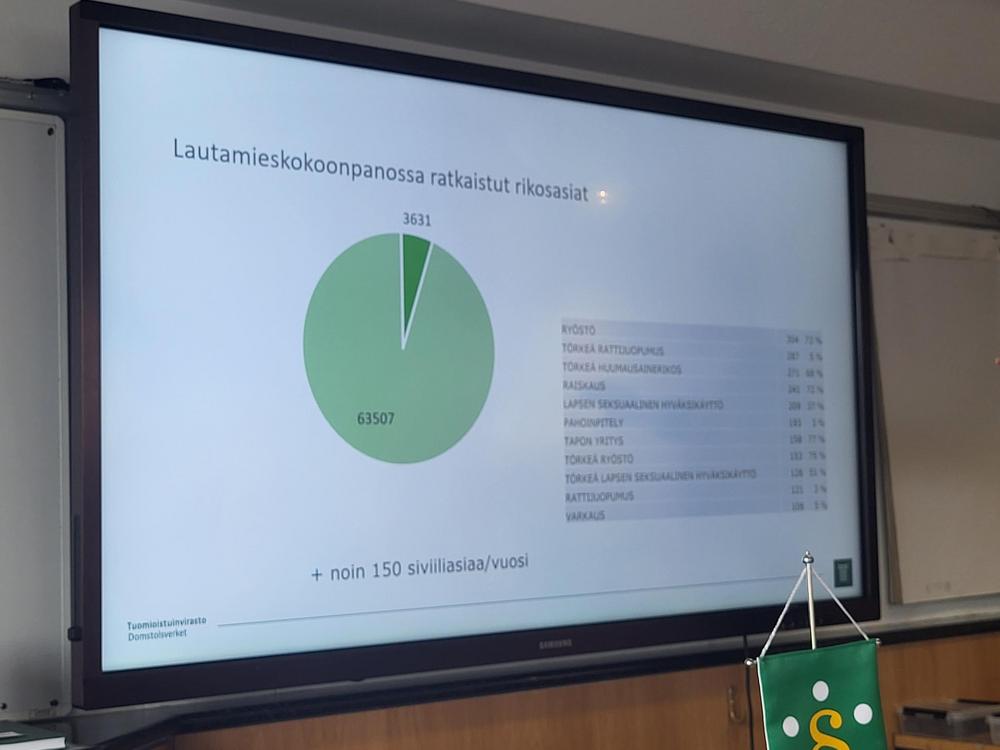 Maittavan lounaan jälkeen kuulimme yleiskatsauksen Syyttäjälaitoksen toiminnasta aluesyyttäjä Juha-Mikko Hämäläisen esittelemänä. Seuraavana puhujavuorossa oli rikoskomisario Lauri Pajunoja Keskusrikospoliisista. Koulutuspäivän mielenkiintoisen annin päätti puheenjohtaja Heilimä.